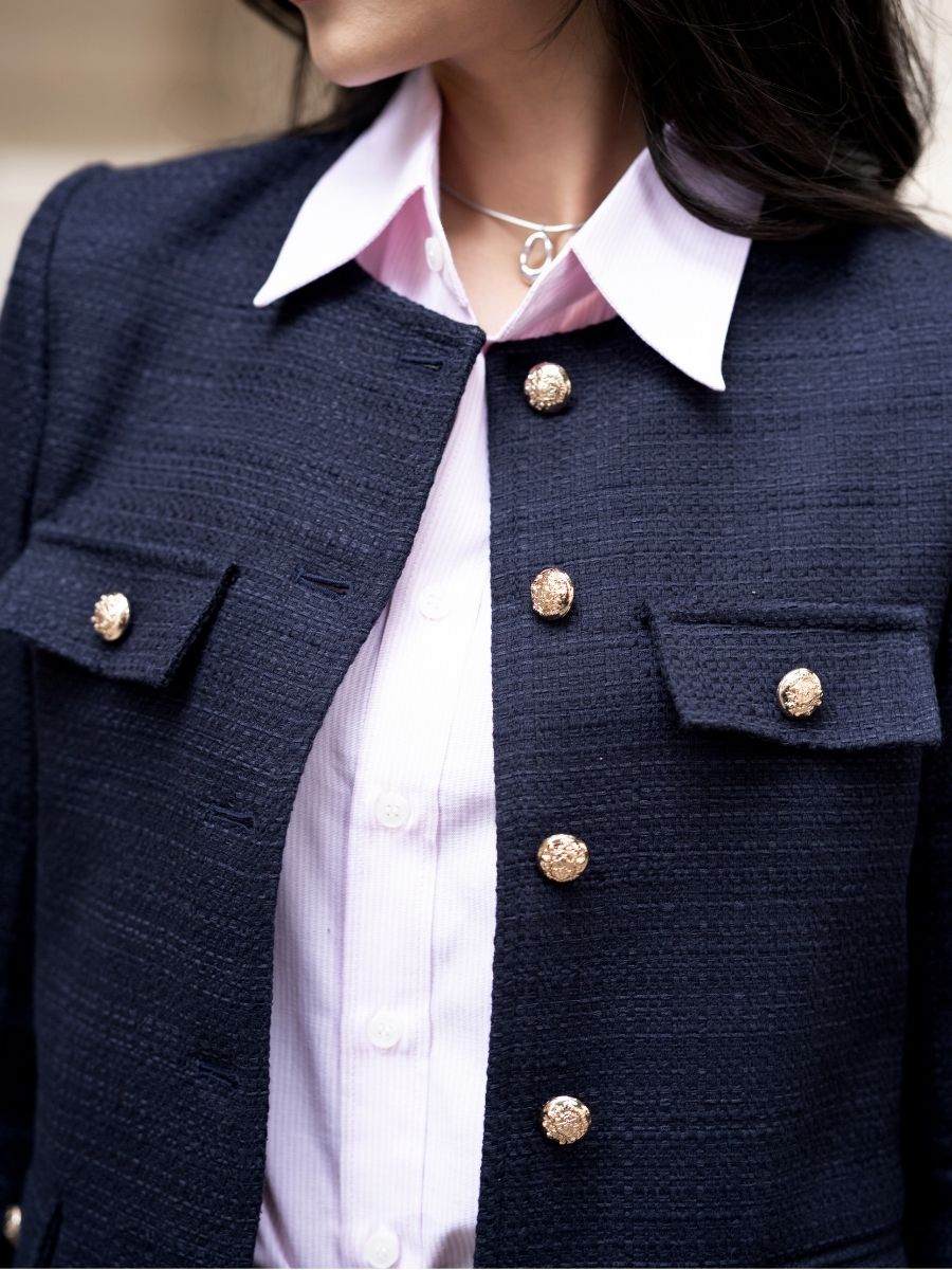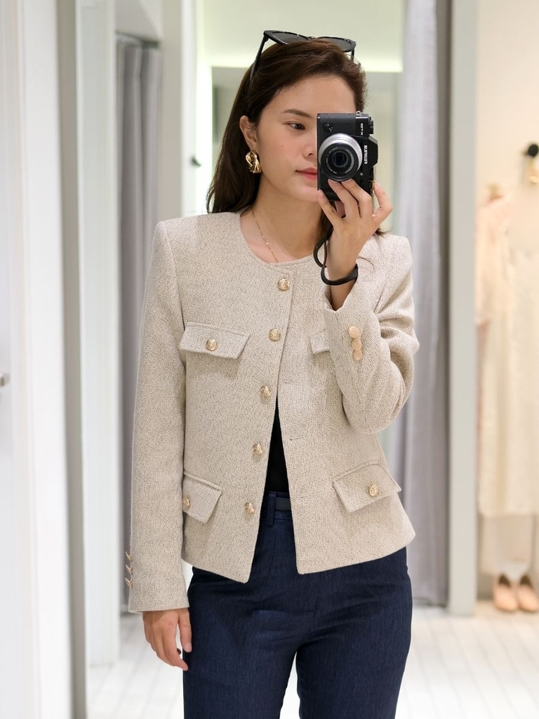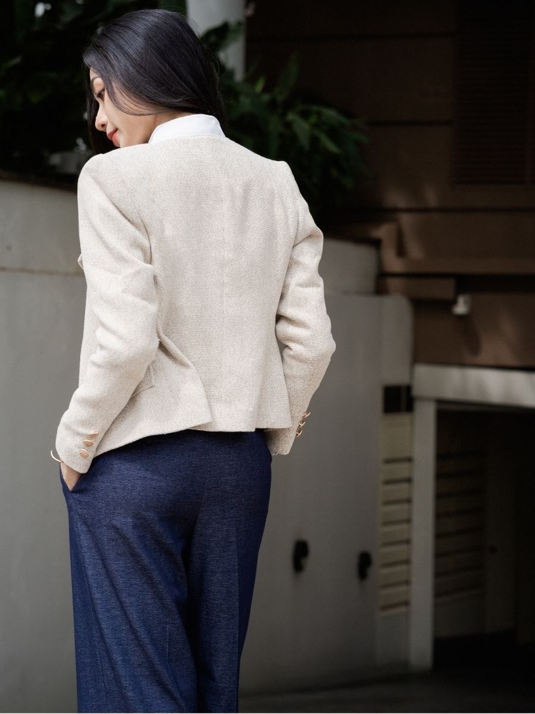 Thiết kế không cổ giúp tôn lên đường cổ thanh thoát, hàng nút kim loại chạm nổi trở thành điểm nhấn sang trọng, thể hiện vẻ đẹp hiện đại và tinh giản. Độ dài vừa chạm eo giúp tạo tỷ lệ cân đối, dễ dàng phối cùng sơ mi, chân váy bút chì hoặc quần tây để biến hoá linh hoạt cho nhiều bối cảnh khác nhau.