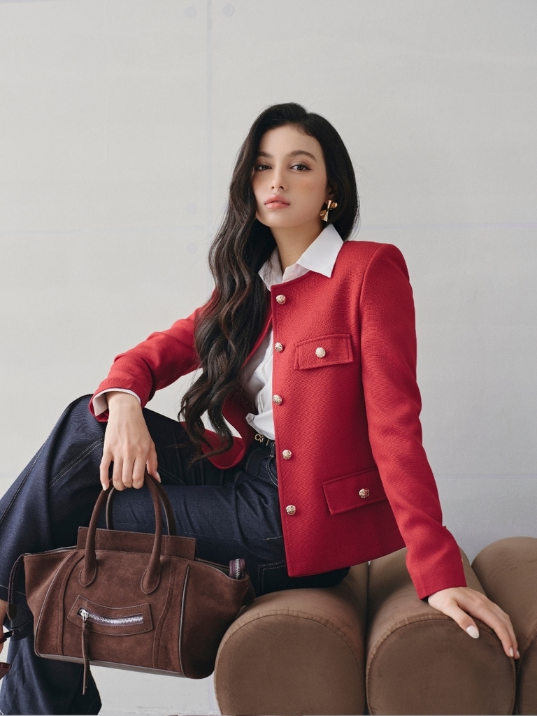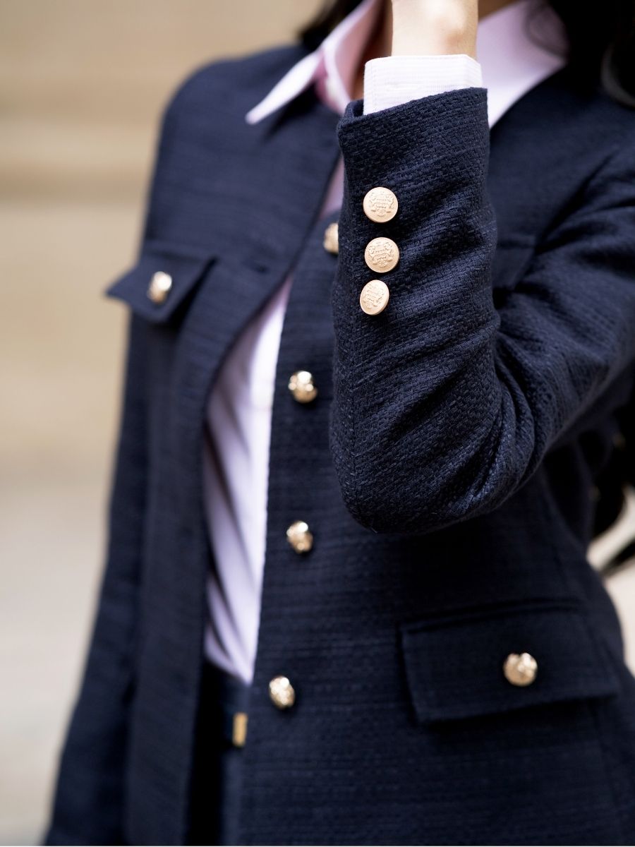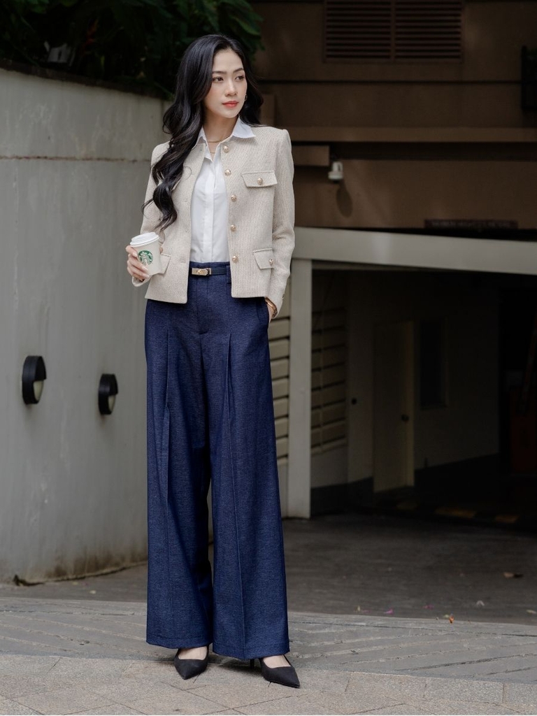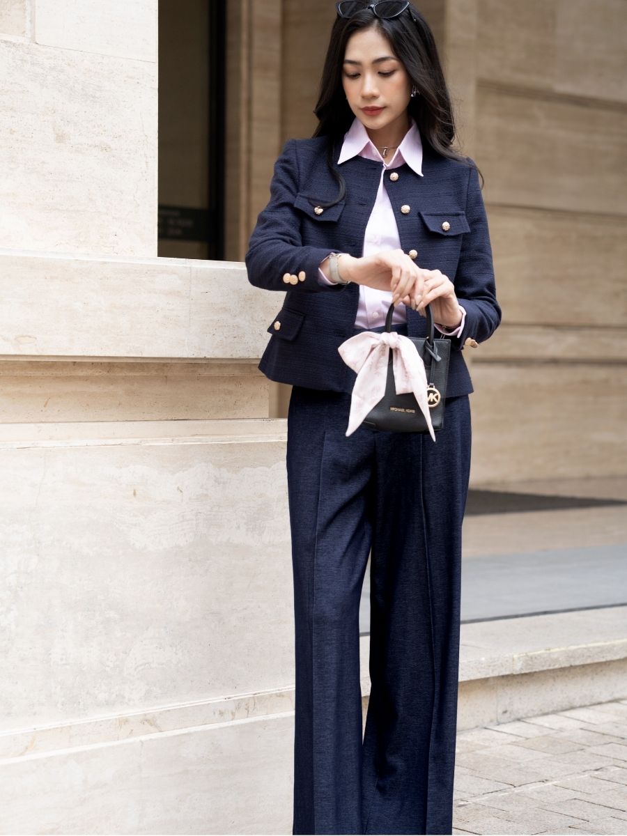 Thiết kế không cổ giúp tôn lên đường cổ thanh thoát, hàng nút kim loại chạm nổi trở thành điểm nhấn sang trọng, thể hiện vẻ đẹp hiện đại và tinh giản. Độ dài vừa chạm eo giúp tạo tỷ lệ cân đối, dễ dàng phối cùng sơ mi, chân váy bút chì hoặc quần tây để biến hoá linh hoạt cho nhiều bối cảnh khác nhau.