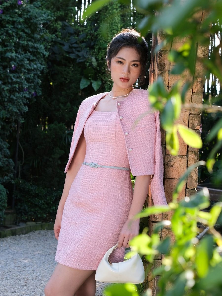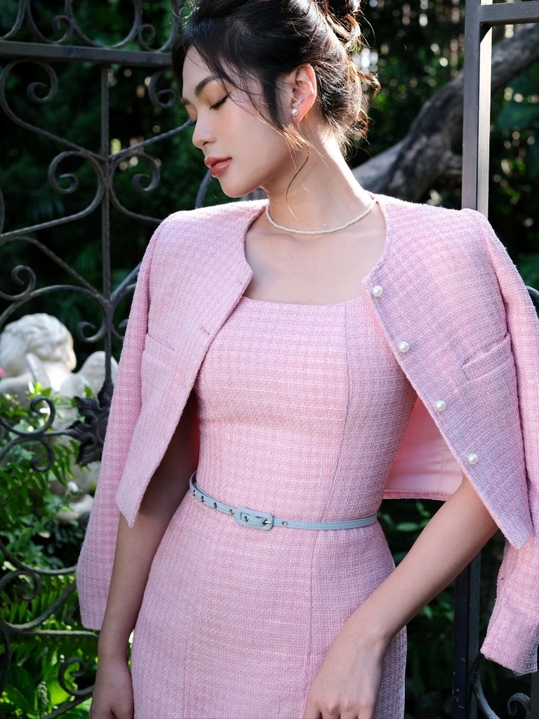 Chất liệu là điểm nhấn đặc biệt: tweed pha sợi nhung đầy tinh tế, kết hợp cùng gam màu hồng nhẹ nhàng mang đến vẻ đẹp sang trọng, đậm chất nữ tính và thời thượng.