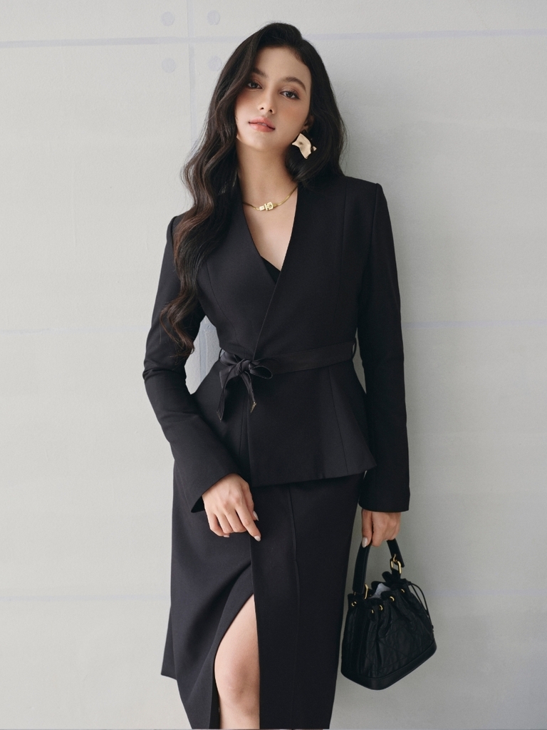 Clair Blazer gây ấn tượng với chi tiết dây đai cột nơ xéo hông, lấy cảm hứng từ cách thắt áo kimono Nhật Bản. Thiết kế giúp định hình vòng eo một cách mềm mại, đồng thời làm dịu phom dáng có cấu trúc, tạo hiệu ứng nữ tính nhưng vẫn giữ được sự dứt khoát và rõ nét.