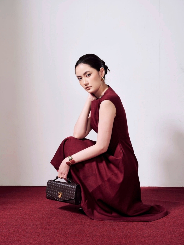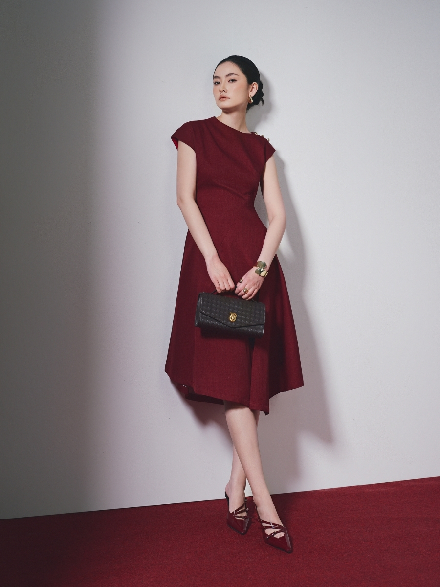 Thiết kế đầm xòe với vạt xéo tạo độ rủ tự nhiên, mang đến chuyển động mềm mại theo từng bước chân, đồng thời tôn dáng một cách tinh tế và nữ tính. Phom dáng được xử lý khéo léo để vừa đủ nổi bật nhưng vẫn giữ được nét thanh lịch, hiện đại.