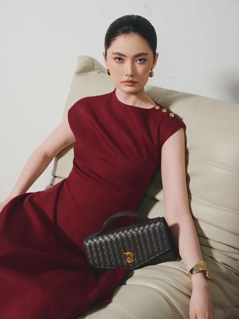 Tổng thể theo hướng tối giản nhưng không đơn điệu, nổi bật với chi tiết nút kim loại sáng ở phần vai, tạo điểm nhấn nhẹ nhàng mà vẫn thu hút, phù hợp cho nhiều hoàn cảnh từ dạo phố đến những dịp cần sự chỉn chu.