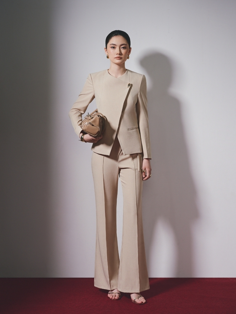 Set suit tone be mang phom dáng tinh gọn, khắc họa vẻ ngoài thanh lịch và hiện đại theo cách nhẹ nhàng nhưng đầy cuốn hút. Tổng thể hướng đến sự tối giản, với các chi tiết cắt may tinh tế giúp trang phục luôn giữ được sự chỉn chu và dễ dàng ứng dụng trong nhiều hoàn cảnh.
