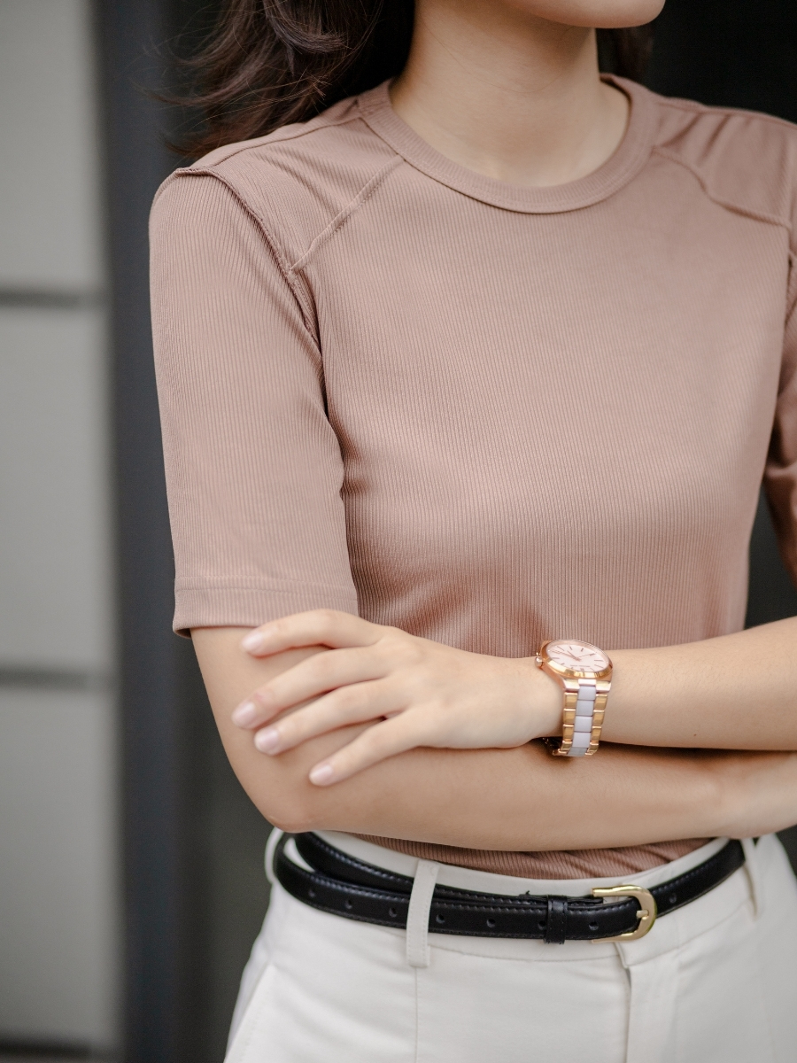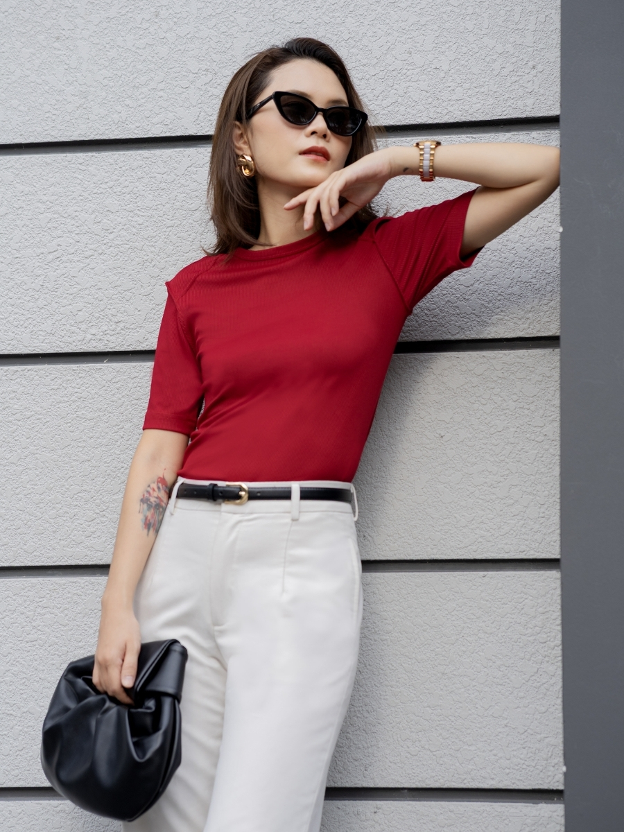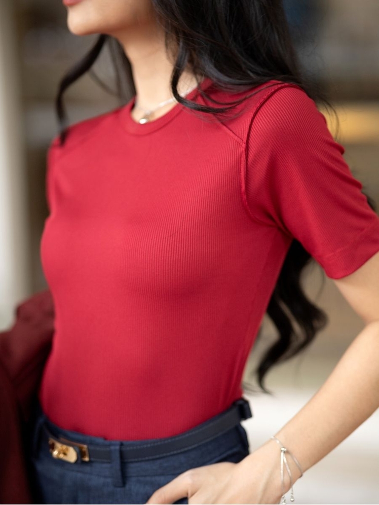 Chất liệu thun gân co giãn thoải mái, mềm mịn, phù hợp cho cả ngày dài năng động. Dễ dàng phối cùng quần tây, chân váy hoặc jeans cho nhiều lựa chọn phong cách từ công sở thanh lịch đến streetstyle thời thượng.