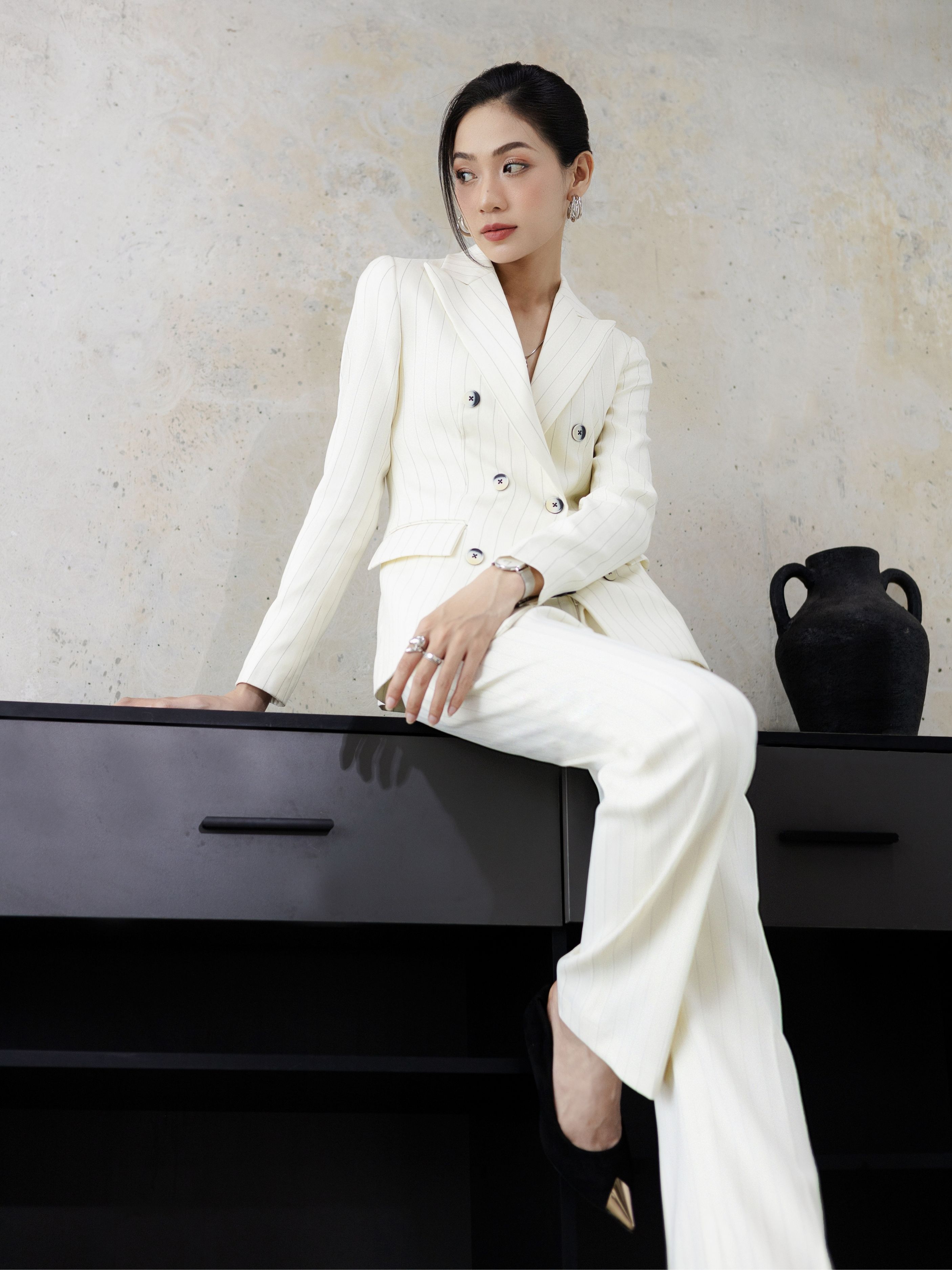 Một thiết kế suit công sở được tạo nên từ vải sọc xương cá (Herringbone) – chất liệu biểu tượng của sự sang trọng và chuẩn mực. Bộ trang phục mang lại cảm giác chuyên nghiệp nhưng vẫn đủ tinh tế để người phụ nữ hiện đại tự tin trong mọi khoảnh khắc.