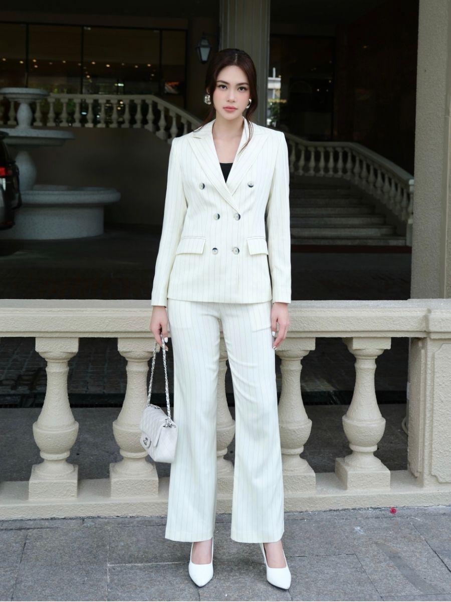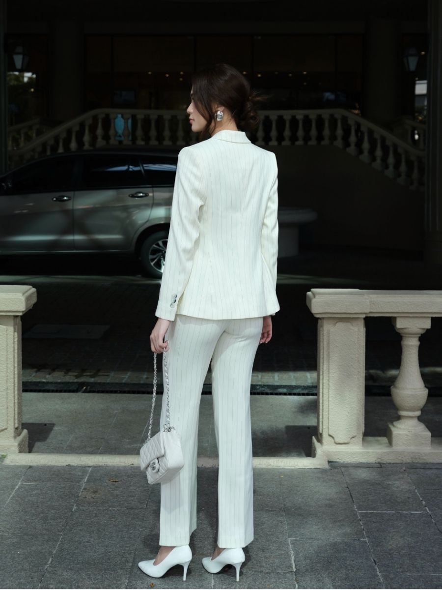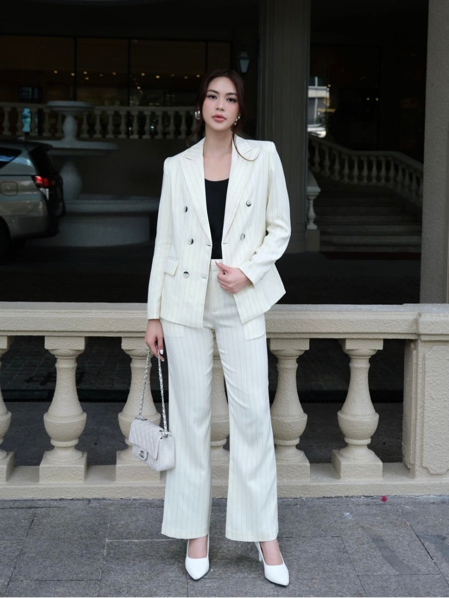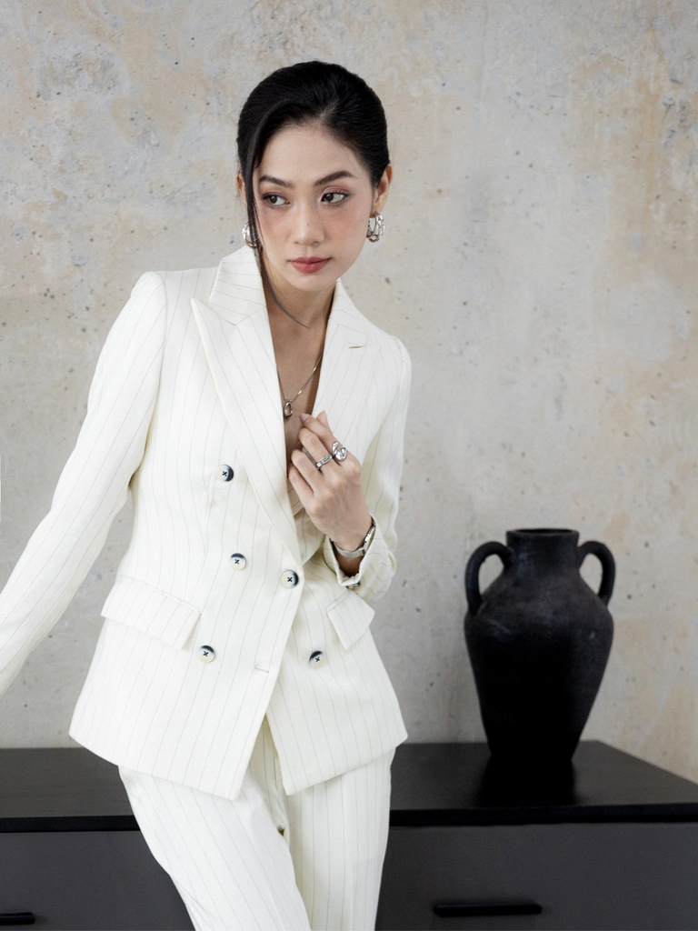 Một thiết kế suit công sở được tạo nên từ vải sọc xương cá (Herringbone) – chất liệu biểu tượng của sự sang trọng và chuẩn mực. Bộ trang phục mang lại cảm giác chuyên nghiệp nhưng vẫn đủ tinh tế để người phụ nữ hiện đại tự tin trong mọi khoảnh khắc.