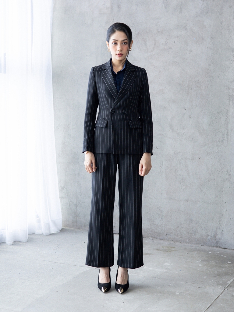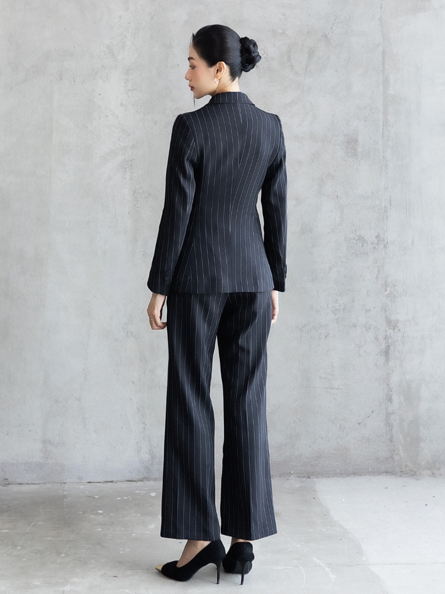 Quần mang gam đen chủ đạo với họa tiết sọc dọc thanh mảnh, giúp tạo hiệu ứng kéo dài dáng người và tôn lên phong thái thanh lịch. Chất liệu được làm từ sợi T kết hợp Rayon dệt xương cá, mang đến nhiều ưu điểm vượt trội: