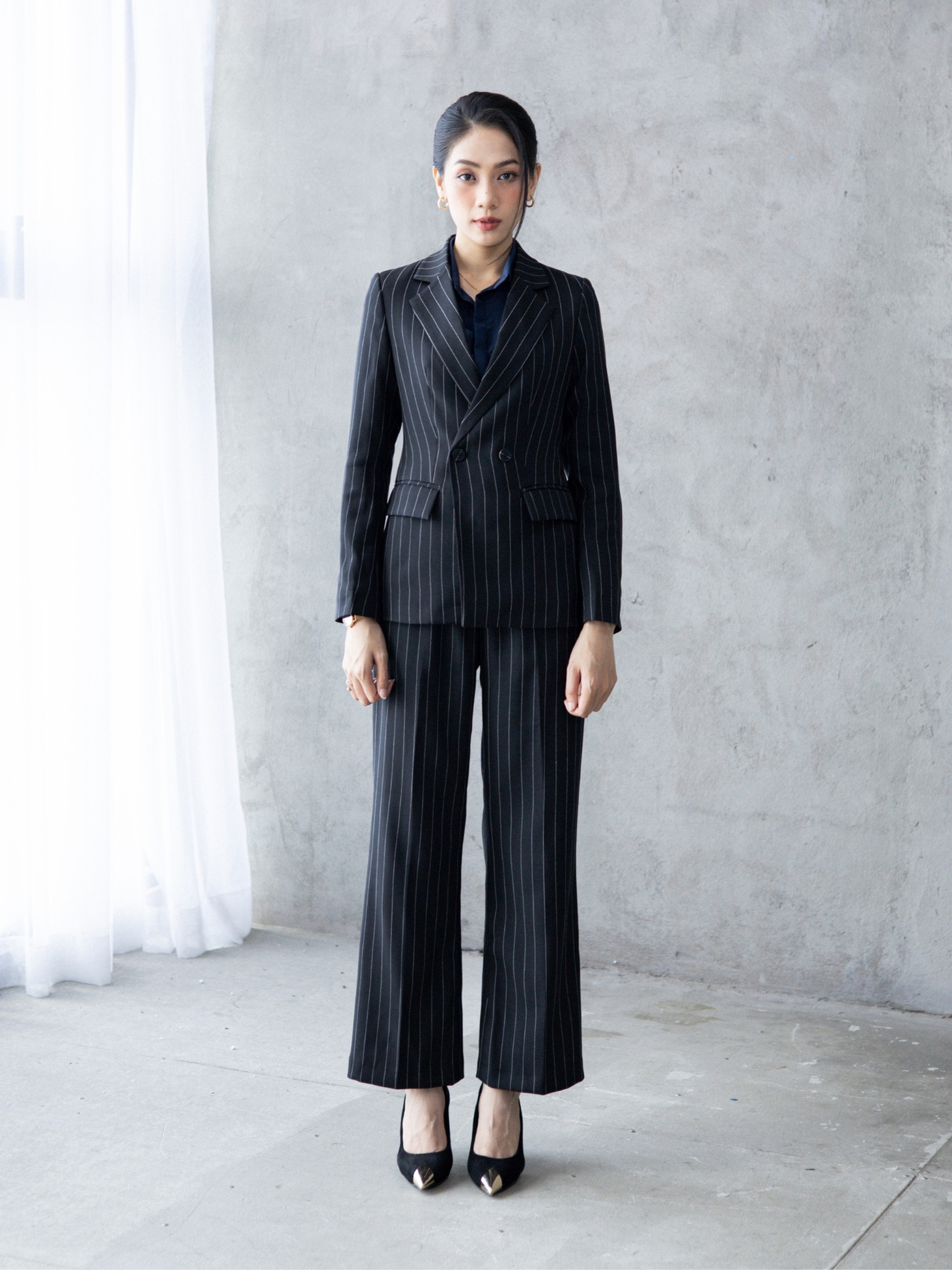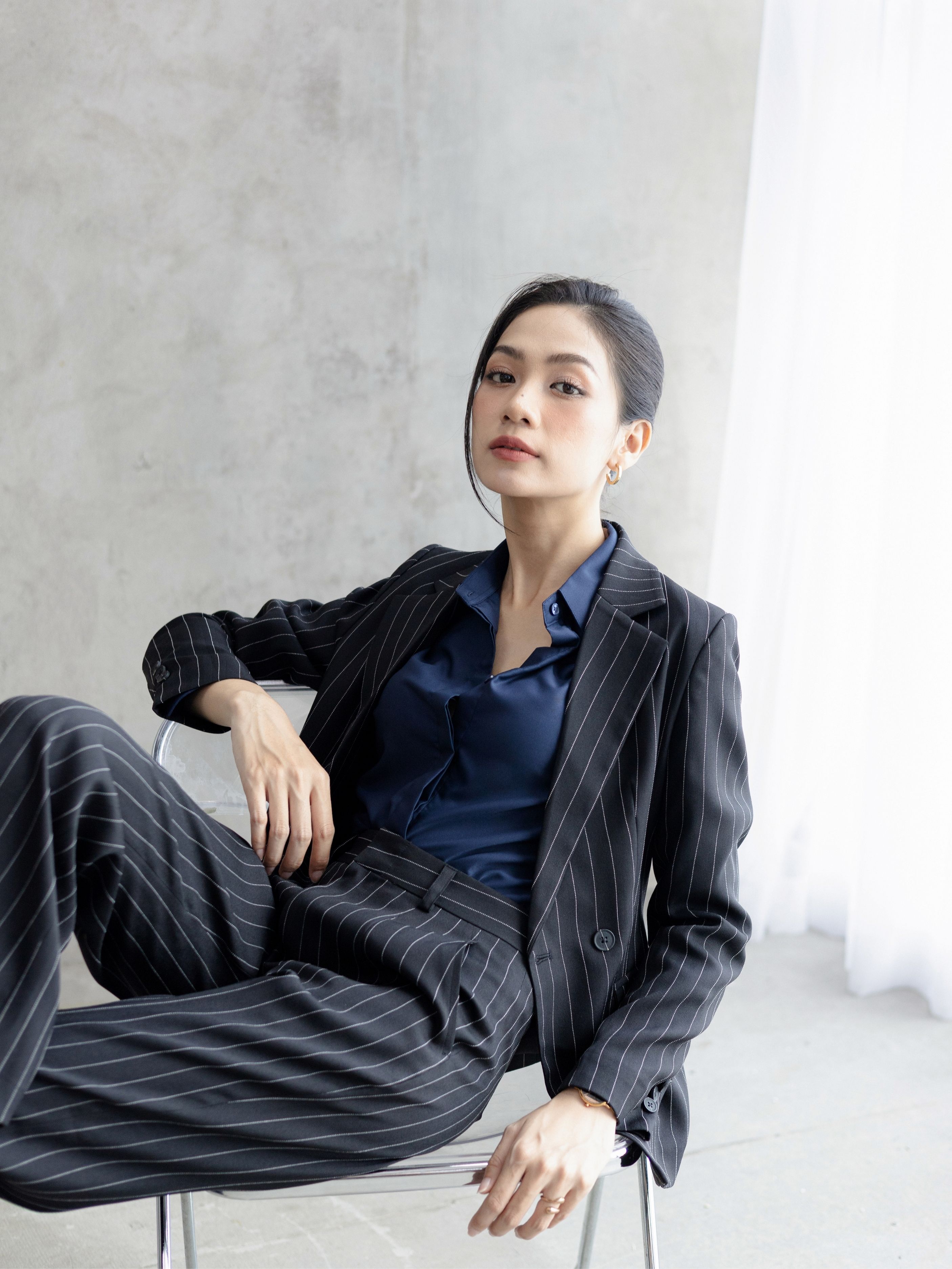 Chiếc blazer mang gam đen chủ đạo với họa tiết sọc dọc thanh mảnh, giúp tạo hiệu ứng kéo dài dáng người và tôn lên phong thái thanh lịch. Chất liệu được làm từ sợi T kết hợp Rayon dệt xương cá, mang đến nhiều ưu điểm vượt trội:
