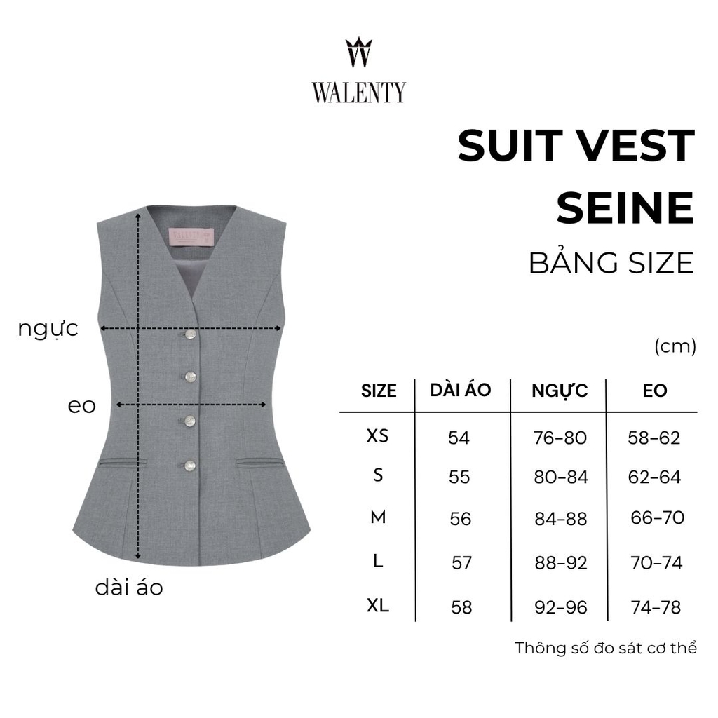 Suit vest may bằng liệu vải cotton đứng form, có tính quy chuẩn cao thường dùng trong những dịp quan trọng, lịch sự. Phom dáng vừa vặn, chiết eo nhẹ giúp tôn dáng hơn, rất phù hợp trong các trang phục công sở.