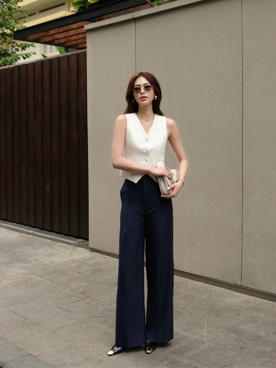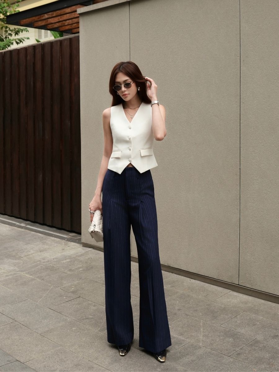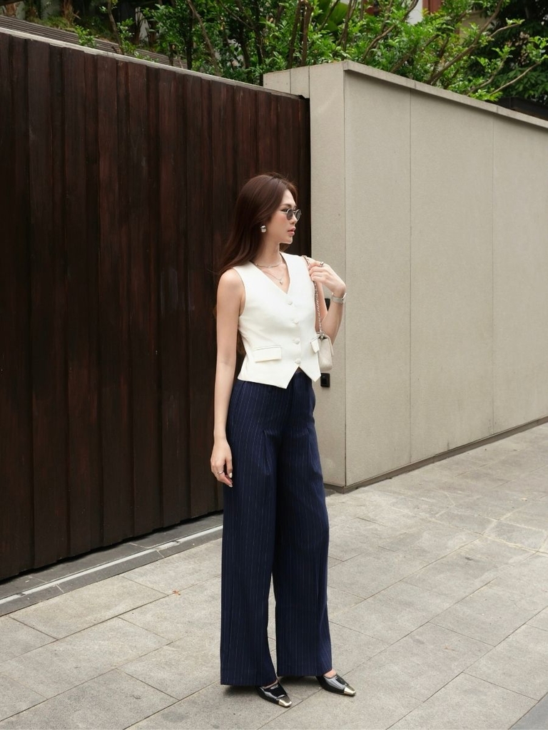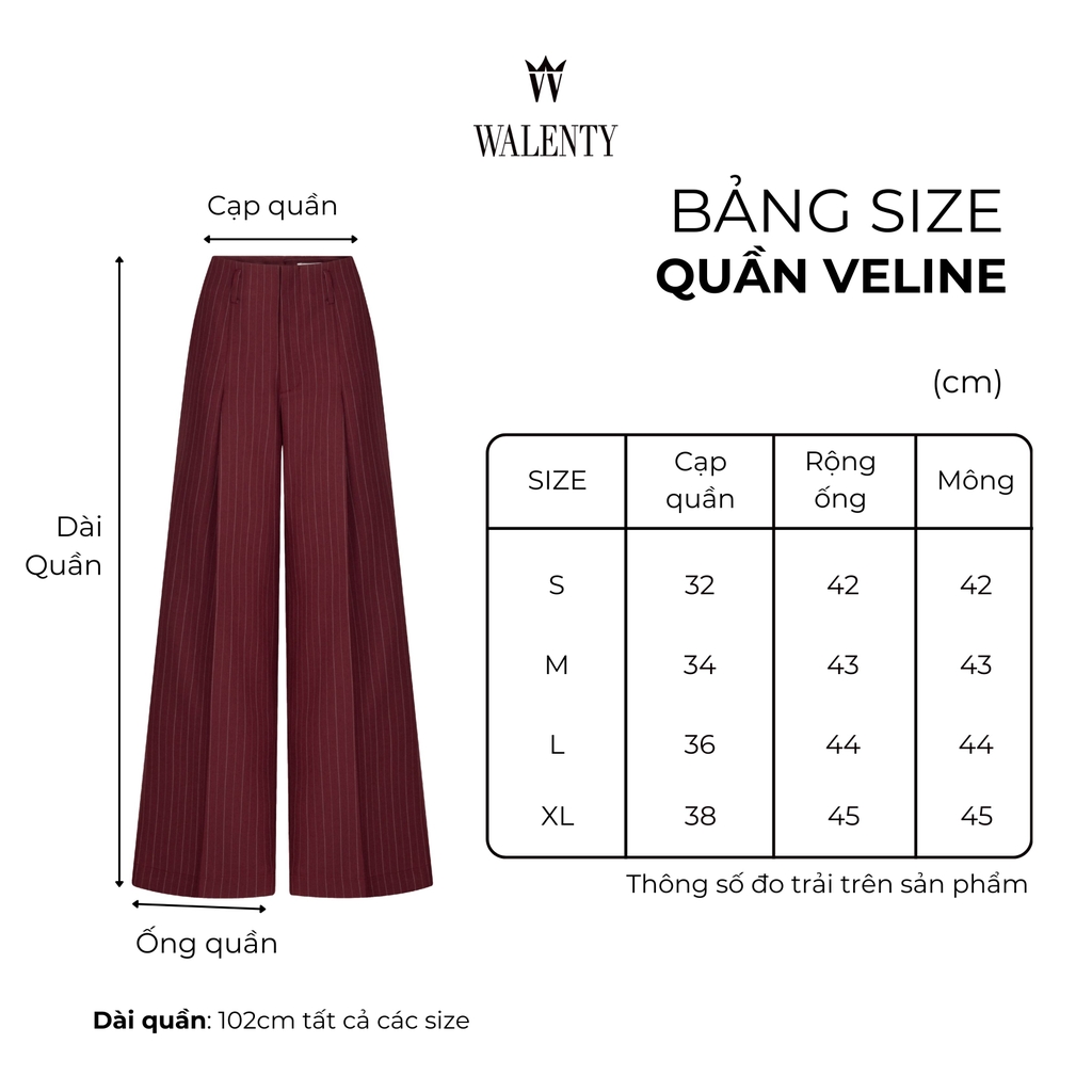 Quần Veline được thiết kế với dáng ống đứng, giúp tạo tỷ lệ gọn gàng và kéo dài đôi chân khi mặc. Phom quần đứng dáng, rơi thẳng từ hông xuống gấu, mang lại cảm giác sắc nét nhưng vẫn dễ vận động, phù hợp cho cả mặc thường ngày lẫn những dịp cần diện mạo chỉn chu.